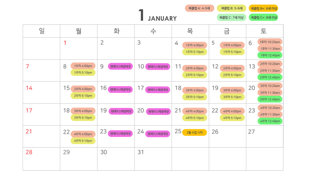 3. 북클럽(월별 신청) 결석이 예상되는 경우, 아래 달력과 시간표를 보시고 같은 주의 보강을 들을 수 있는 요일을 참고해주세요.