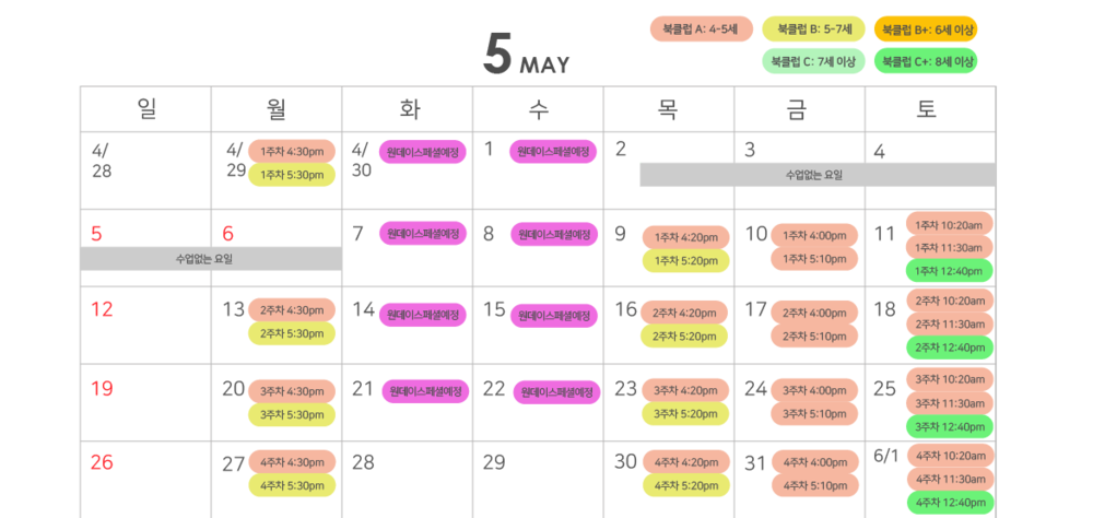 2. 목요반 5월 9/16/23/30일: 오후 5시 20분(6세 이상)