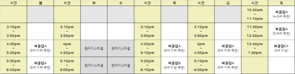 3. 북클럽(월별 신청) 결석이 예상되는 경우, 아래 달력과 시간표를 보시고 같은 주의 보강을 들을 수 있는 요일을 참고해주세요.