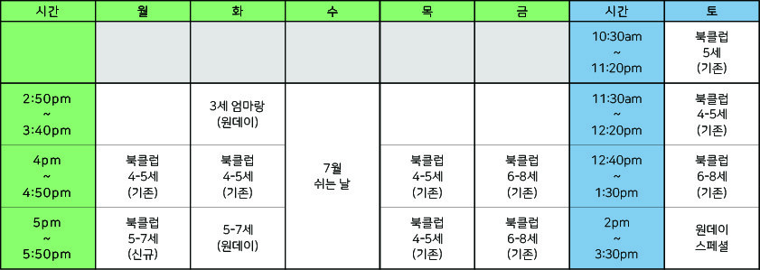 토요반 7월 3/10/17/24일: 오전 10시 30분(기존, 2) 11시 30분 (기존, 마감)