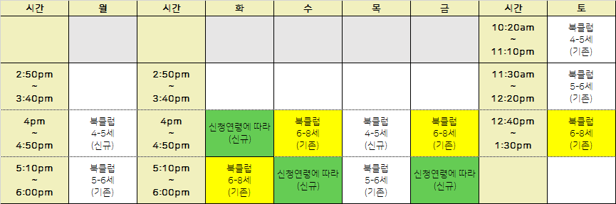 금요반 6월 10/17/24/7월 1일: 오후 4시 (기존, 7-9세 위주)/ 5시 10분 (신규 신청이 모일 경우)