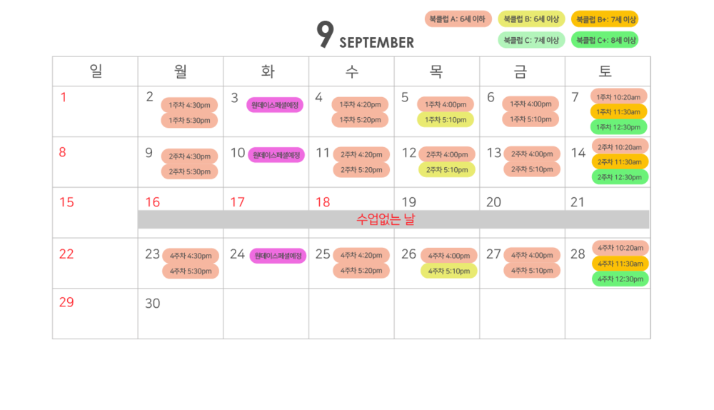 3. 북클럽(월별 신청) 결석이 예상되는 경우, 아래 달력과 시간표를 보시고 같은 주의 보강을 들을 수 있는 요일을 참고해주세요.