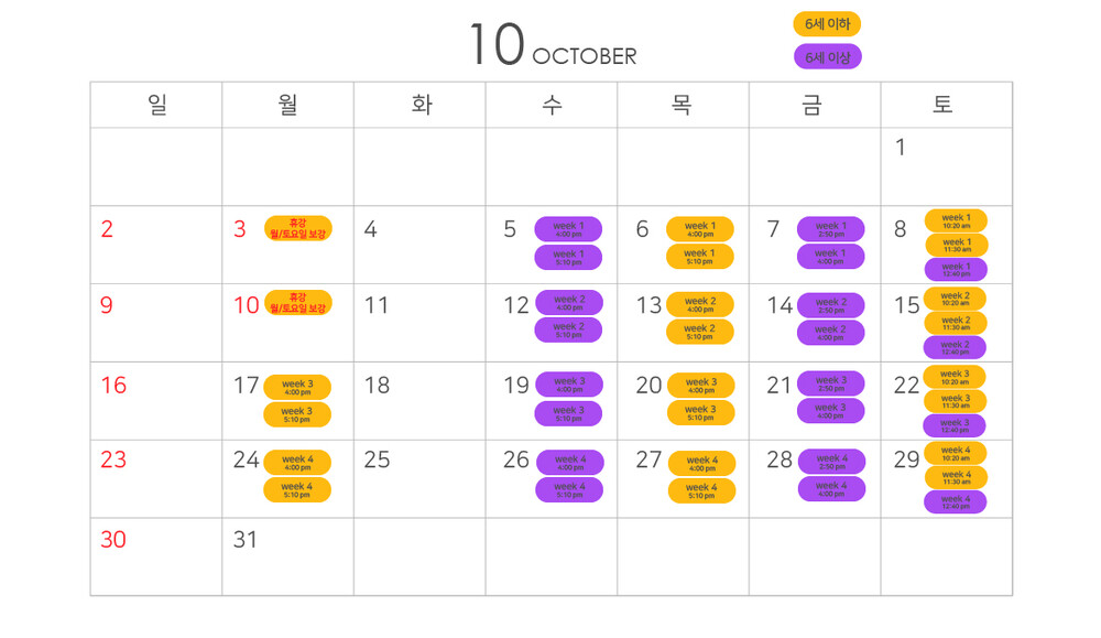 토요반 10월 8/15/22/29일: 오전 10시 20분 (4-5세 위주), 11시 30분 (5-6세 위주)