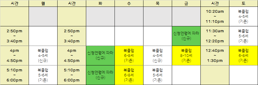 2. 수요반 1월 4/11/18/25일: 오후 4시 (기존, 6-8세 위주) 5시 10분 (기존, 6-8세 위주)