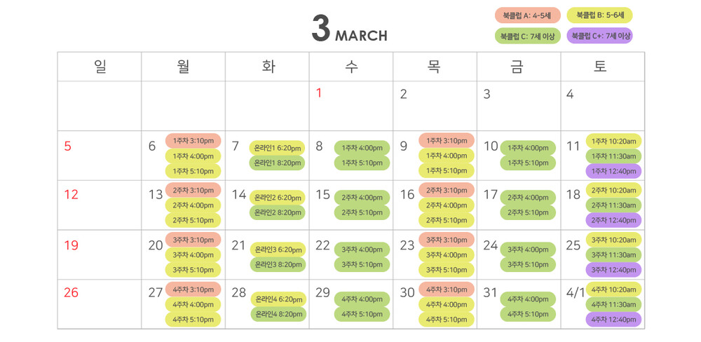 금요반 3월 10/17/24/31일: 오후4시, 5시 10분