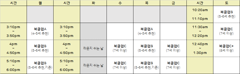 3. 북클럽(월별 신청) 결석이 예상되는 경우, 아래 달력과 시간표를 보시고 같은 주의 보강을 들을 수 있는 요일을 참고해주세요.