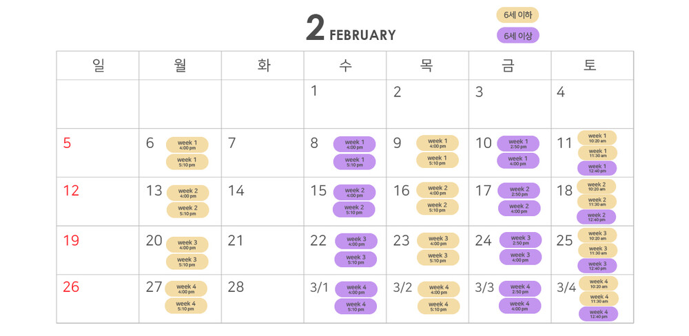 2. 수요반 2월 8/15/22/3월 1일: 오후 4시 (기존, 6-8세 위주) 5시 10분 (기존, 6-8세 위주)