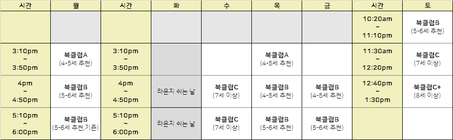 3. 북클럽(월별 신청) 결석이 예상되는 경우, 아래 달력과 시간표를 보시고 같은 주의 보강을 들을 수 있는 요일을 참고해주세요.