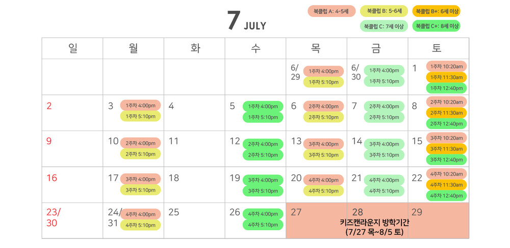 3. 북클럽(월별 신청) 결석이 예상되는 경우, 아래 달력과 시간표를 보시고 같은 주의 보강을 들을 수 있는 요일을 참고해주세요.