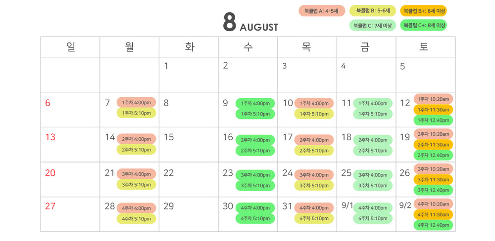 2. 월요반 8월 7/14/21/28일: 오후 4시(4-5세)