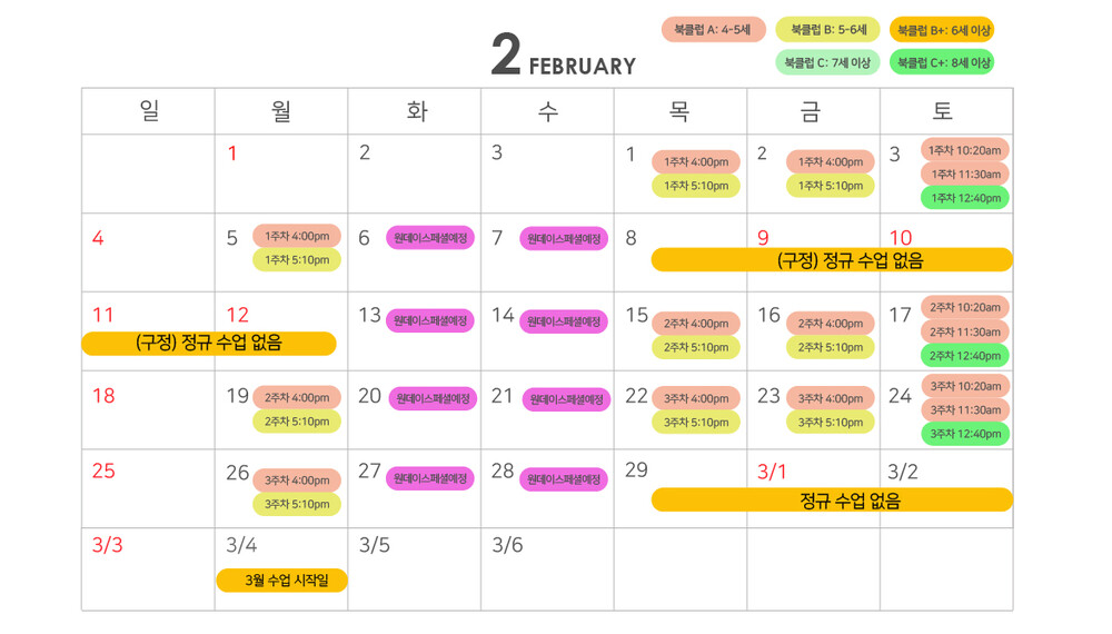 2. 월요반 2월 5/19/26일(2월 12일 설 연휴 휴강): 오후 4시(6세 이하, 4-5세 추천)